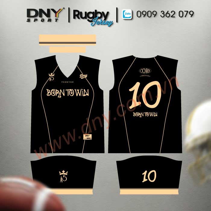 Bạn muốn khẳng định phong cách đỉnh cao của đội mình? Mẫu đồng phục áo bóng bầu dục nam nữ Born To Win mang sắc đen huyền bí, phối viền vàng champagne tinh tế, tượng trưng cho sức mạnh và sự tự tin tuyệt đối. Logo BORN TO WIN được in cách điệu với kiểu chữ hoàng gia, mang thông điệp “Chiến thắng là bản năng”. Cổ chữ V phối vàng sang trọng, vai và tay áo bo gọn mang lại form dáng cứng cáp và mạnh mẽ. Đặt may ngay hoặc xem thêm các mẫu jersey áo bóng bầu dục độc đáo nhất tại đây.