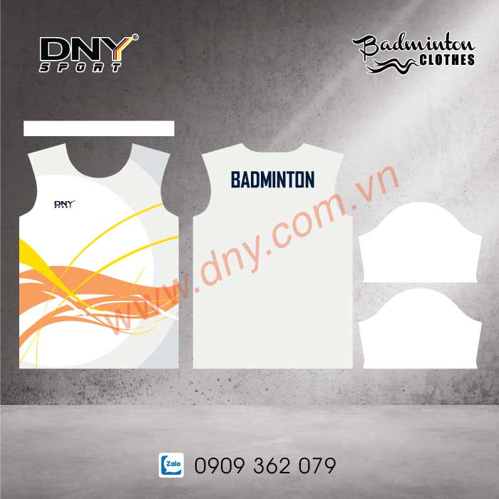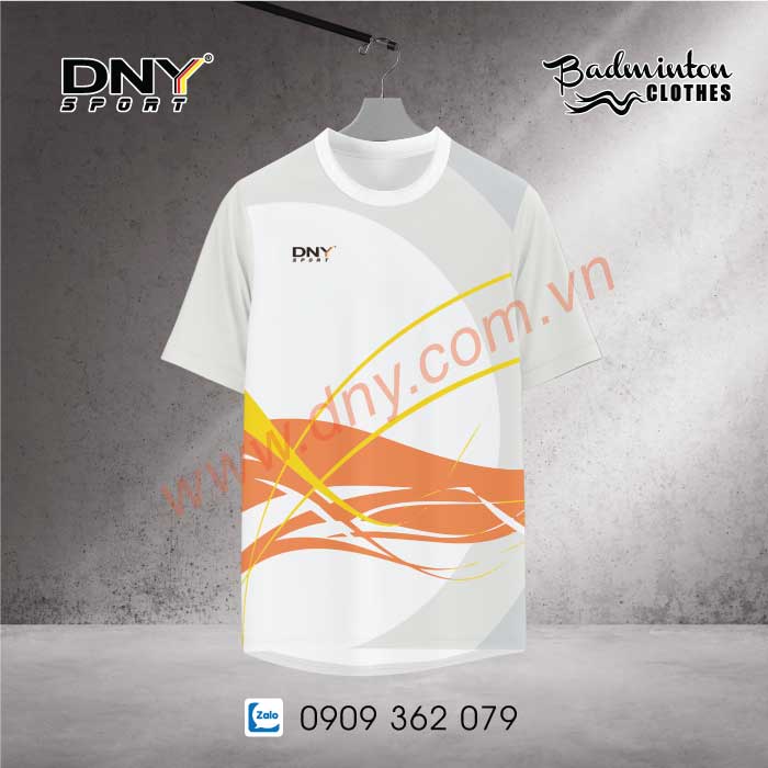 Đường nét mềm mại – Sắc màu tươi sáng, đậm chất chuyển động: Mẫu áo cầu lông thiết kế trên nền trắng phối cam vàng nổi bật với các đường cong mềm mại như mô phỏng chuyển động của cầu và vợt. Họa tiết uốn lượn tạo chiều sâu thị giác và cảm giác lan tỏa năng lượng, mang lại tổng thể hài hòa, hiện đại. Thiết kế phù hợp với tinh thần thi đấu thể thao nhưng vẫn trẻ trung, thanh lịch. Mặt sau in chữ BADMINTON tạo điểm nhấn mạnh mẽ.