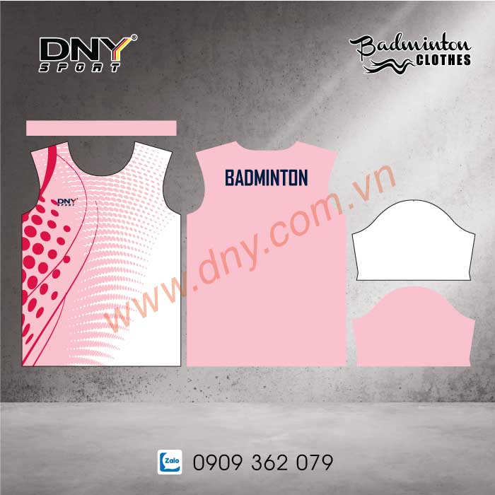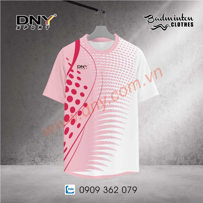 Họa tiết bo cong nổi bật – Phối màu tươi sáng, hiện đại: Mẫu áo cầu lông mang sắc hồng pastel kết hợp trắng tinh khôi, nổi bật với họa tiết chấm bo cong chạy dọc thân trước, tạo cảm giác chuyển động nhẹ nhàng nhưng vẫn mạnh mẽ. Phần vai, tay áo và lưng phủ trọn màu hồng, trong khi mặt trước tạo điểm nhấn với mảng trắng và các nét in chuyển sắc tinh tế. Logo thể thao phía trước tối giản, mặt sau in chữ BADMINTON cùng biểu tượng năng động, phù hợp tinh thần thi đấu hiện đại. Đây chính là mẫu áo cầu lông phiên bản mới nhất, vừa ra mắt dành riêng cho các đội nhóm yêu phong cách hiện đại và nổi bật.
